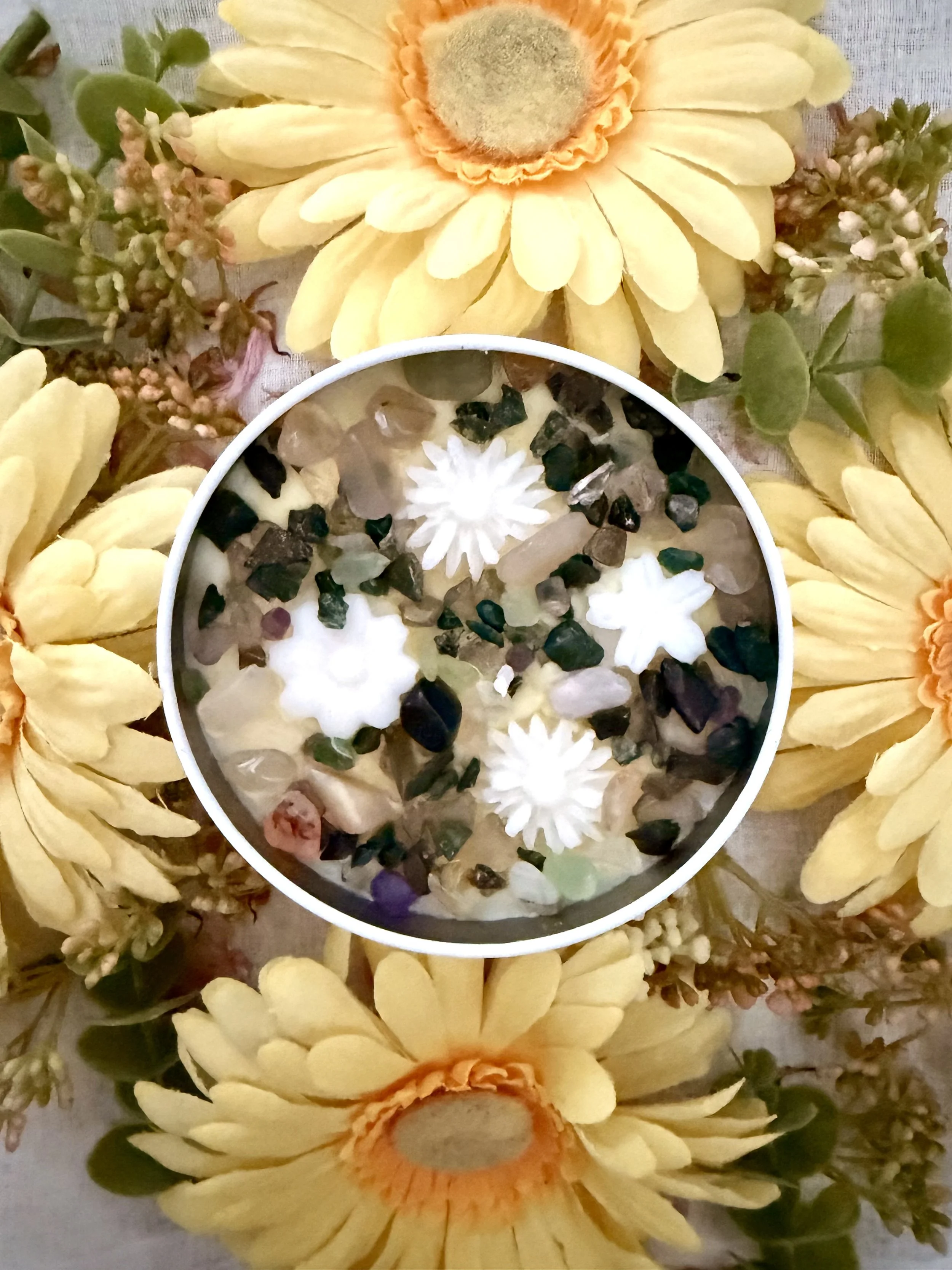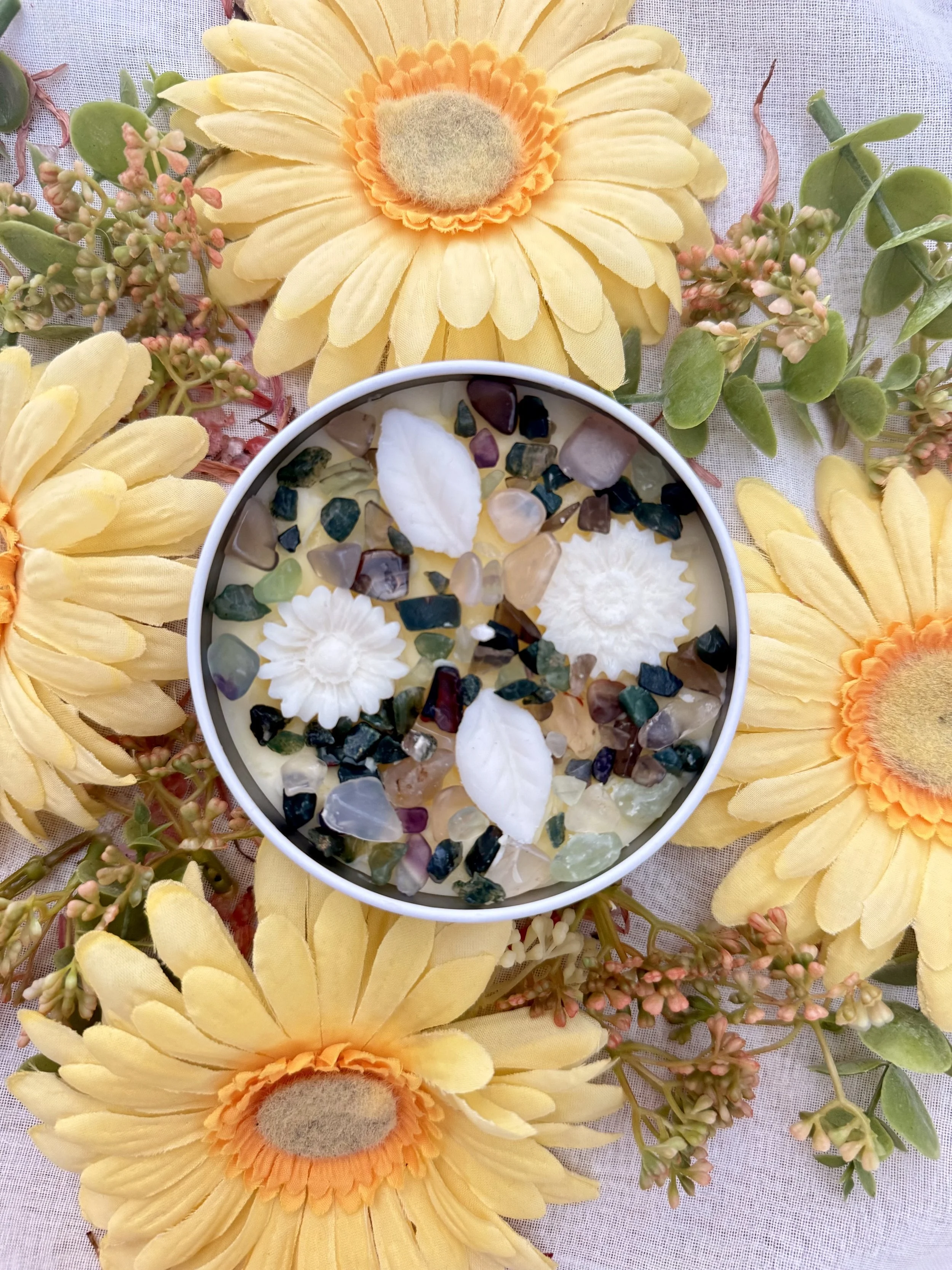 Made with 100% Natural soy wax and finished with our soy wax flowers and meadow inspired colour crystals